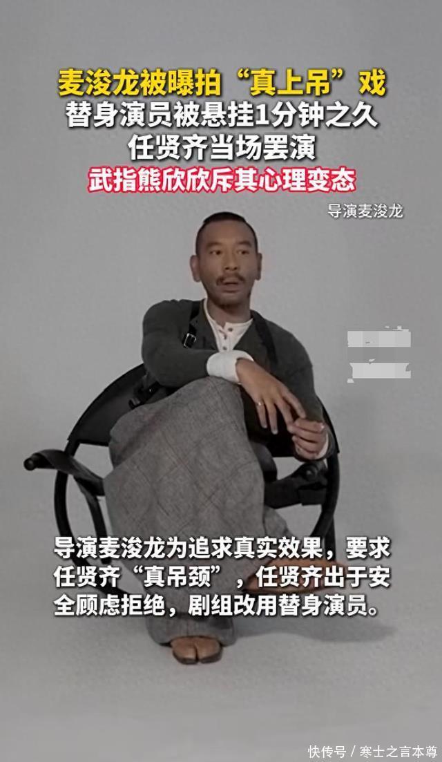 他为了追求更真实的效果,提出要任贤齐实拍, 且不说任贤齐年近60岁,就算换个年轻力壮的小伙子,随随便便上吊也是有风险的。 任贤齐考虑到自身的安全,拒绝了这一拍摄要求,但没想到, 麦浚龙还不愿放弃,还要让替身上。